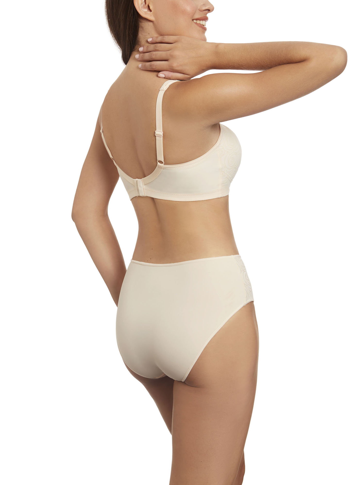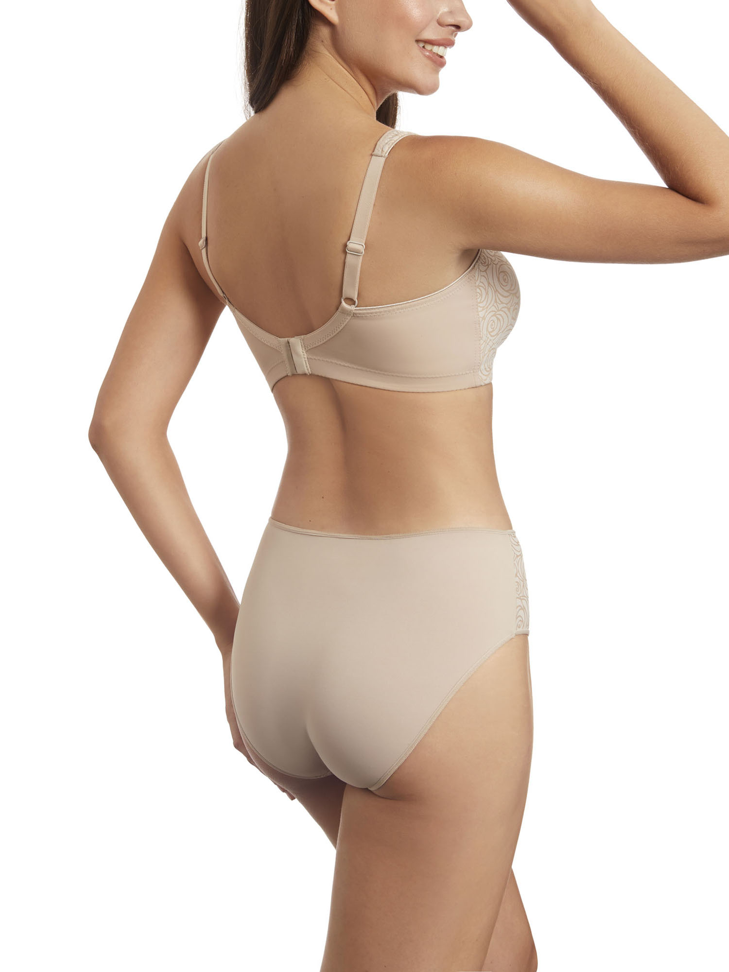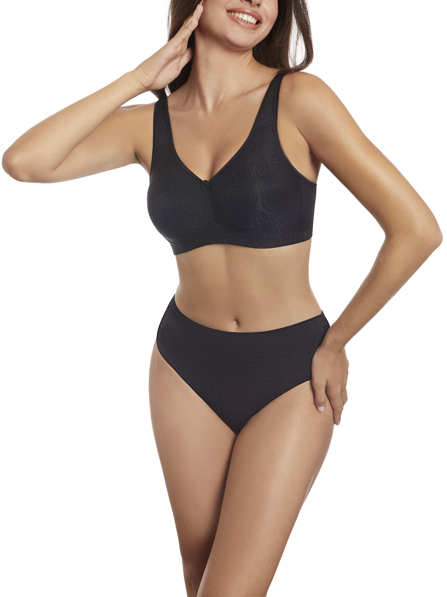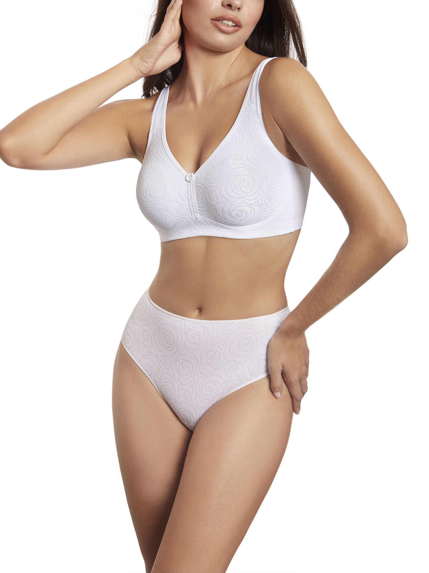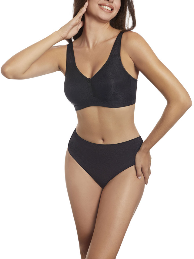 Sujetador sin aros, sin relleno. Fabricado con un elegante tejido estampado y un sutil escote en forma de V.